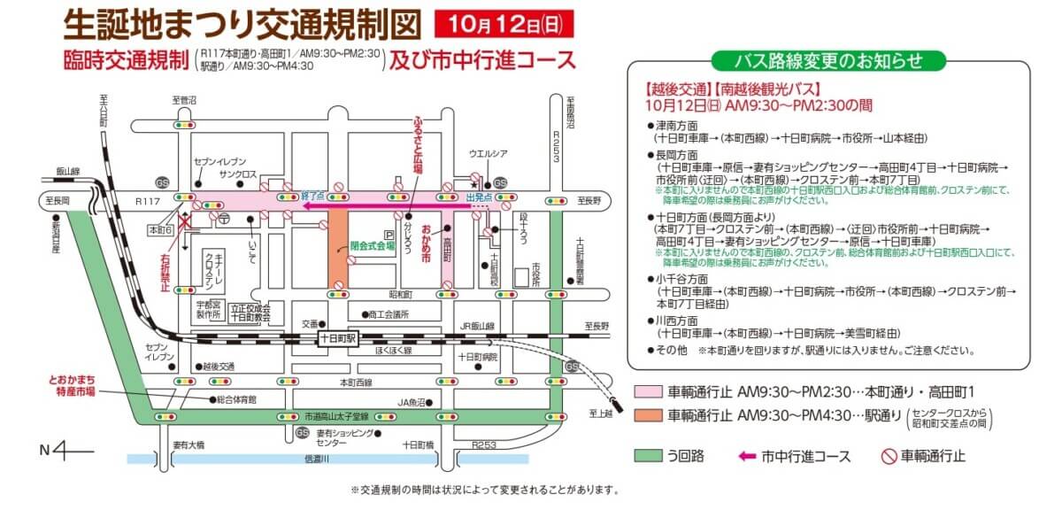 開催時間 | 9時00分~ ・ふるさと広場(分じろうマーケット広場)十日町市のふるさと納税の返礼品をご紹介 10時00分~ ・市中行進(本町1丁目~本町4丁目 約550m)全国各地の郷土芸能、万灯、纏、鼓笛隊、創作ダンス 等 ・おかめ市(高田町1丁目歩行者天国内)屋台やキッチンカー、ステージイベント等盛りだくさん! ・とおかまち特産市場(十日町市総合体育館駐車場)十日町市の地場産品の販売 ※一部会場は交通規制が行われますのでご協力をお願いいたします。 【交通規制時間】 本町通り(本町1丁目~6丁目)、高田町 午前9時30分~午後2時30分 駅通り 午前9時30分~午後4時30分 |