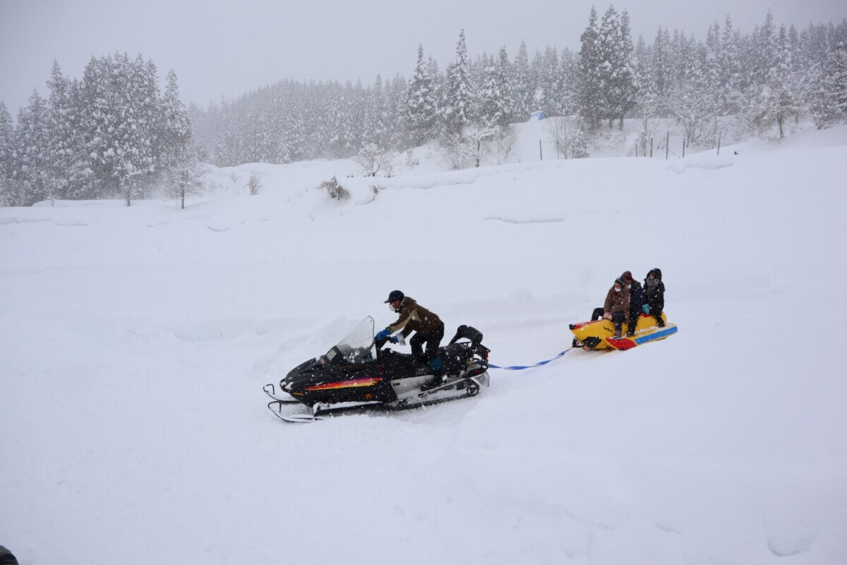 まつだい農舞台での企画展「里山 雪の遊園地」(土日祝のみ開催)が昨日から始まりました!雪山に点在するアート作品を巡ったり、バナナボートやスノーチュービングなどの雪上アクティビティ、ミニイベントを五感で楽しむことができます。