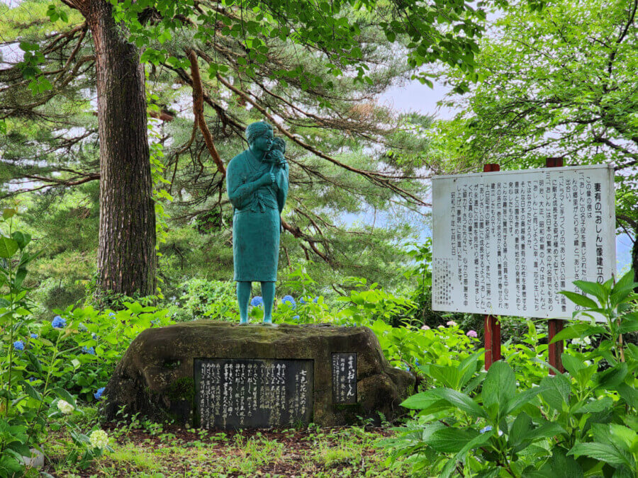 ちなみに、あじさい公園駐車場裏には、あの名作ドラマ「おしん」の像が。おしんの子供時代を演じた小林綾子さんのお母様が十日町市出身というご縁から生まれた像です。