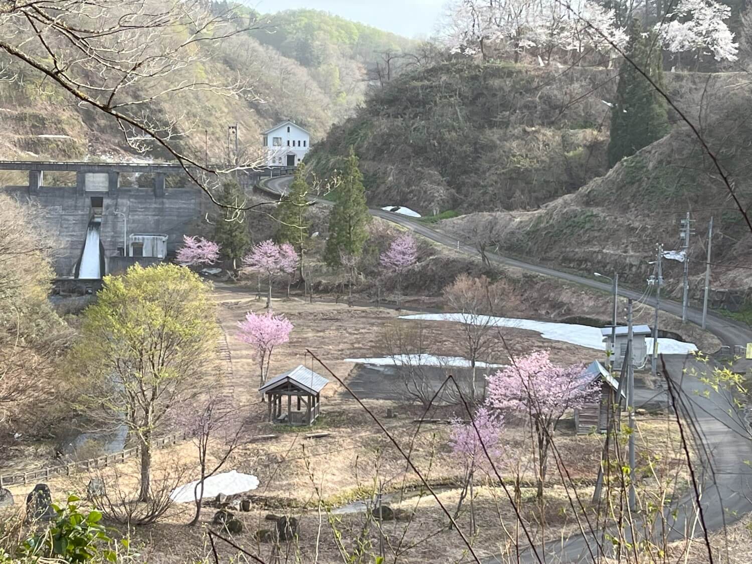 城川ダムは桜も植えられているので春は残雪と桜が楽しめます。