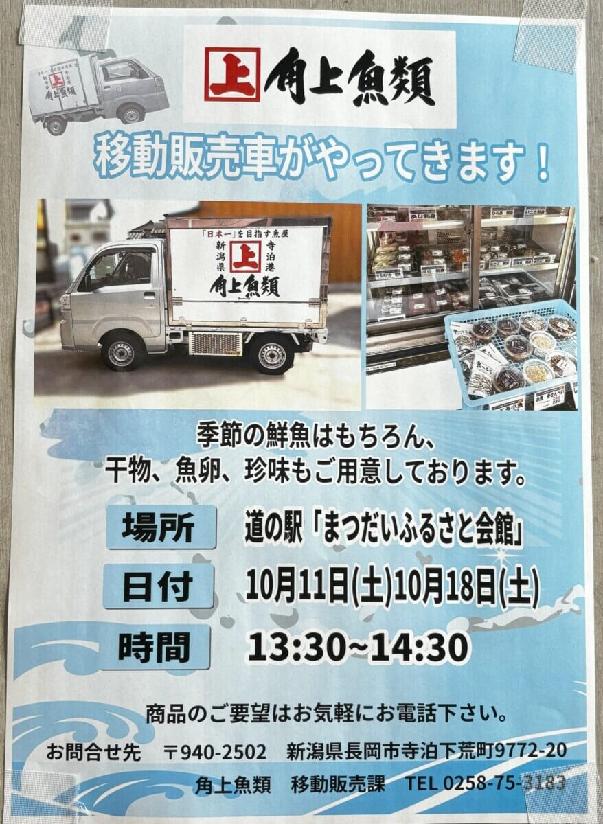 13:30~14:30 角上魚類移動販売(国道側入り口付近にて開催)