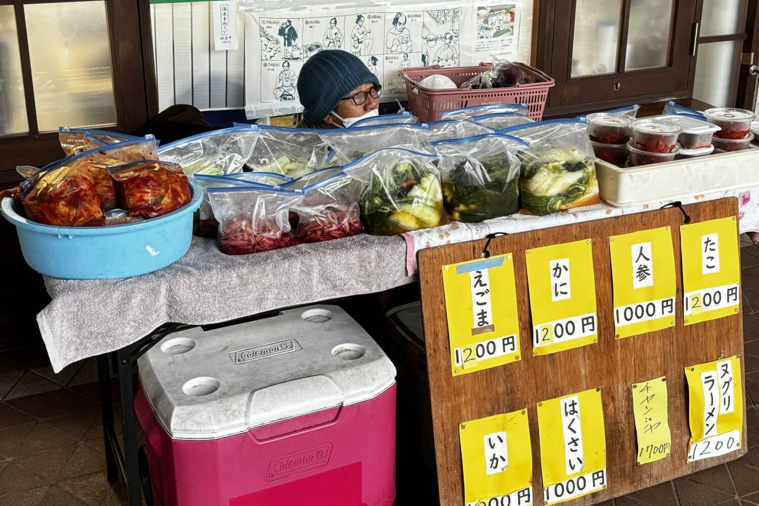 白菜・里いも・ずいき(やつがしらの茎)・生の落花生・大根・さつまいもなどなど。寒くなったら鍋物に入れても美味しいキムチも販売中です。