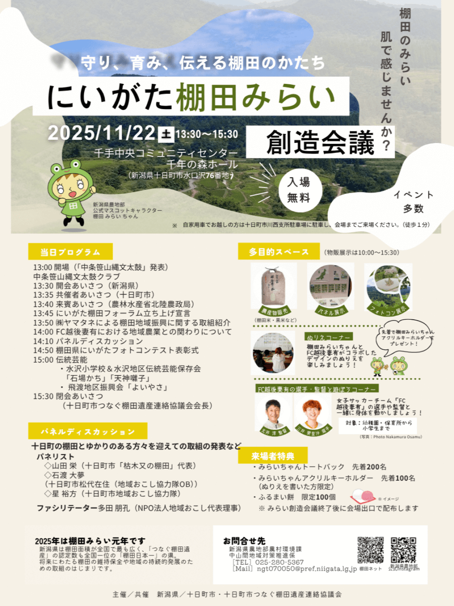 2025年11月22日(土曜日)に、十日町市千手中央コミュニティセンター千年の森ホールにて、「にいがた棚田みらい創造会議」を開催します。