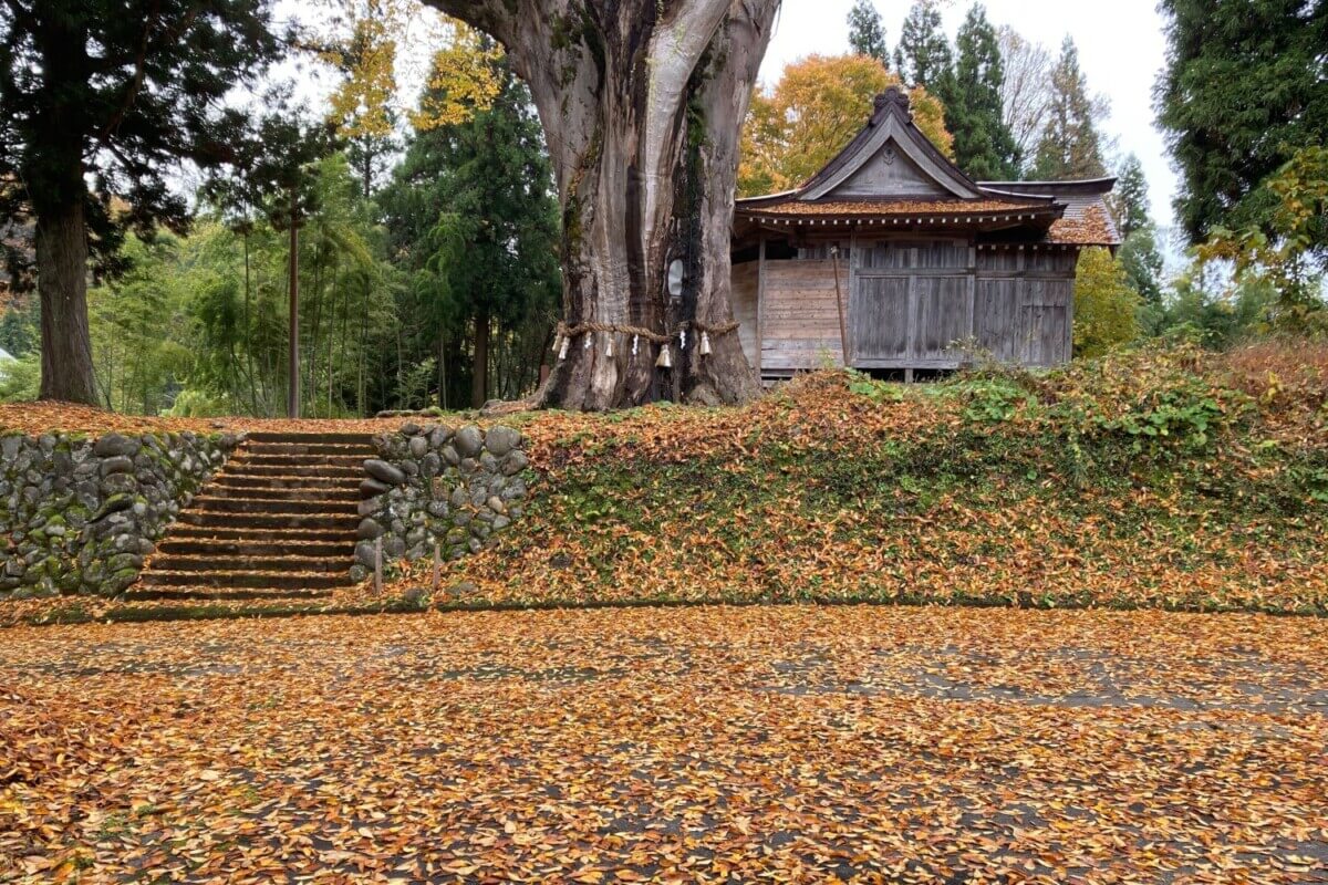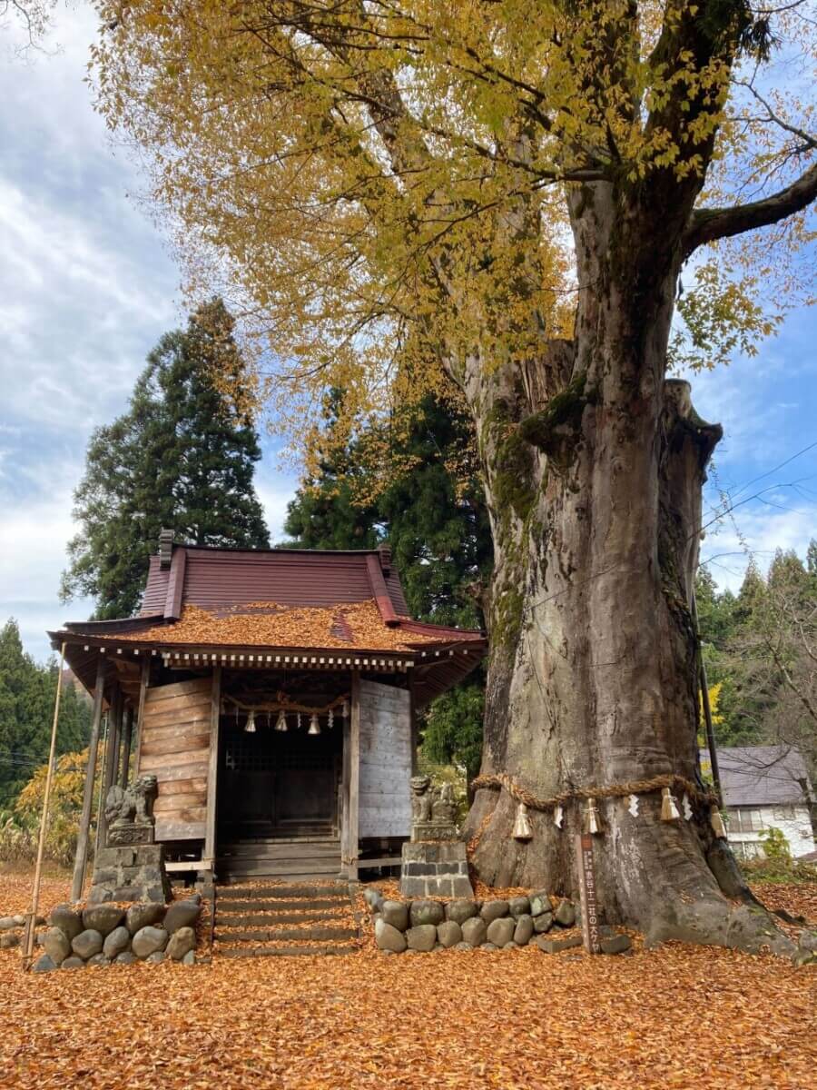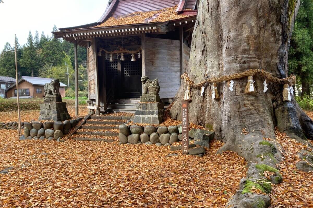 川西エリアにある赤谷十二社の大ケヤキが紅葉ピークを迎えていました。これ以上色が変わることは無いそうで、遠くの場所からも鮮やかな黄色に色付いた巨木があることがわかります。落葉が進んでおり、落ち葉の絨毯もとても美しいです。十二社には冬に備え雪囲いがされていました。数メートルの雪が積もる豪雪地帯とあって、向かって左側に立てられた竹の棒は、重機で除雪する際に狛犬などを傷付けないための目印!