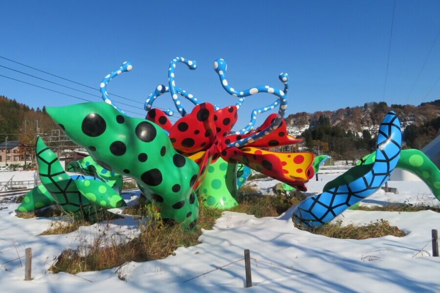南口に展示されている大地の芸術祭作品、草間彌生さんの花咲ける妻有の周りも雪が積もりましたが、お昼過ぎには溶け始めていました。