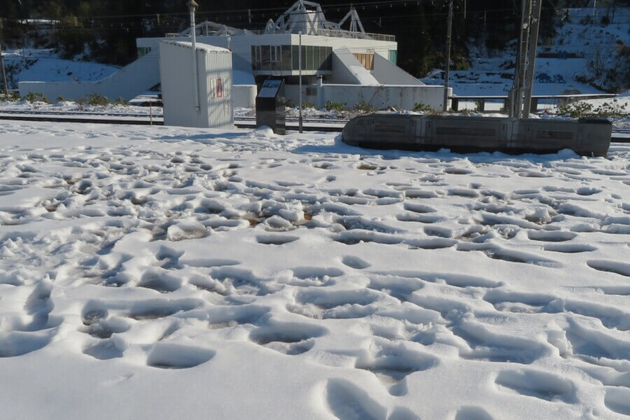 南口の施設が見渡せる、道の駅外部トイレ脇の常春の丘には「特急はくたか記念石碑」があります。この周りは、雪景色を見においでの方か石碑を見に来られた方の足跡がいっぱいでした。