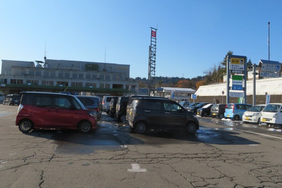 ほくほく線まつだい駅と、併設されている道の駅周辺は、11月20日の朝の寒さで、雪や雪溶け水がガリガリに凍っていましたが、あたたかい太陽の熱のおかげですっかり雪どけし、春のような陽気でした。