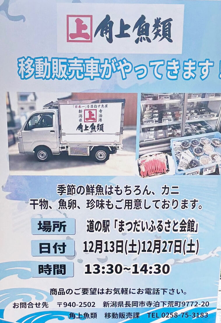 両日共に、13時30分~14時30分の1時間ではありますが、角上魚類移動販売車がやってくる予定です。