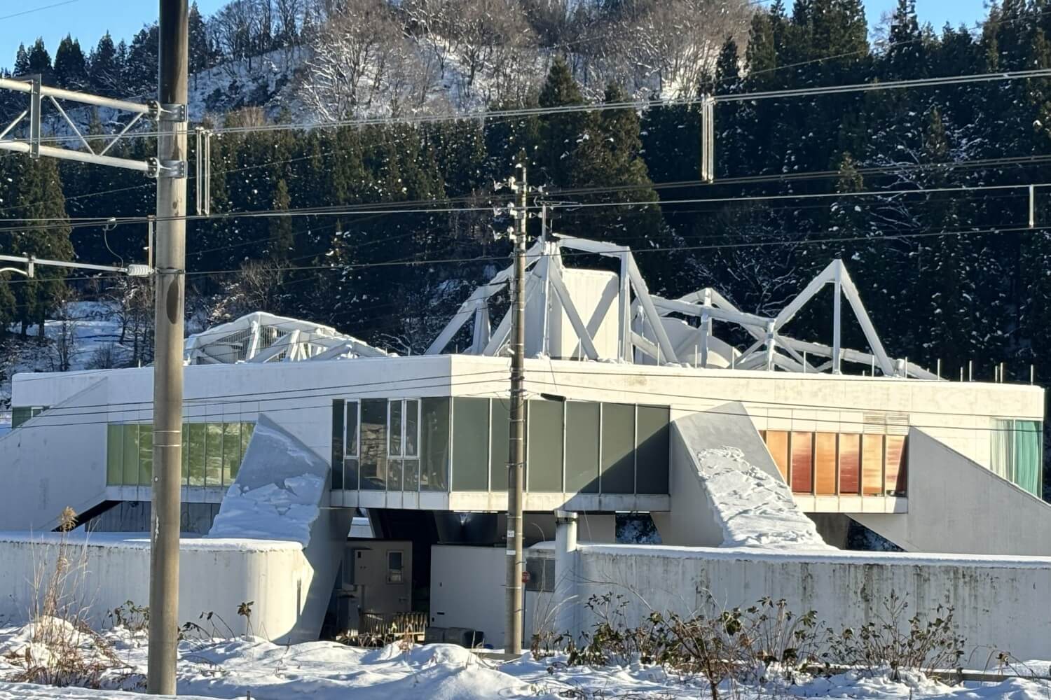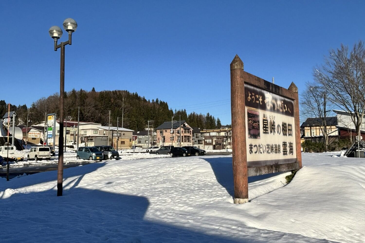 ほくほく線まつだい駅を通る列車からいつも見える「ようこそ まつだいへ」の看板と、道の駅駐車場。夜間に降り積もった雪は陽の光を浴び、朝のザクザクな雪から、サクサクふわふわな溶けやすい状況に変化しています。