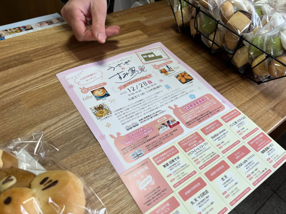 利用者に配布されるチラシには、駅周辺のお店の割引券が付いています