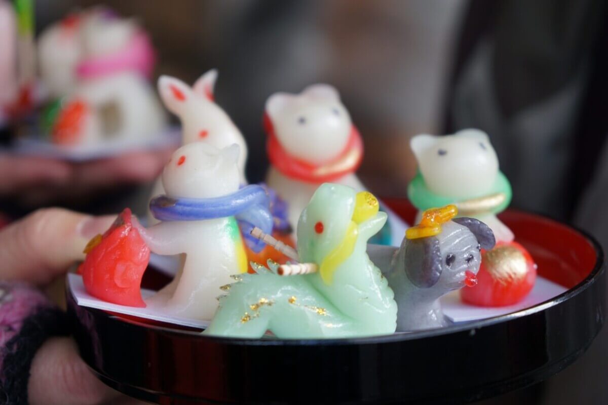 ≪チンコロ≫とは、しんこ(米の粉)を原料にして作った細工物。大きさは3㎝位で、すべて手作りのため一つ一つの顔や表情が異なります。定番のイヌ、ネコ、ウサギといった身近な動物をモチーフにしたものから、干支にちなんだものが多く作られてきました。