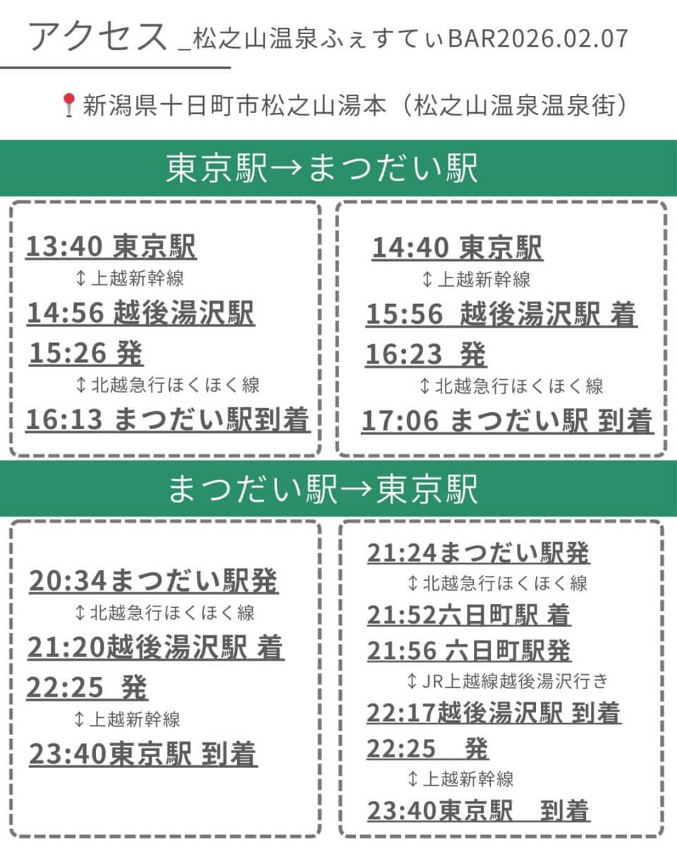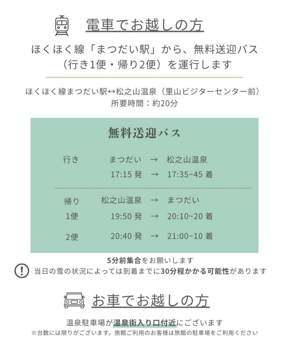 | 交通アクセス | 電車でお越しの方 ◇無料送迎バス(行き1便、帰り2便)を運行 ほくほく線 まつだい駅 ⇔ 松之山温泉(里山ビジターセンター前) ※無料送迎バス(約20分) ※バスの時刻表は公式ページで確認してください。 https://matsunoyamafestibar.wixsite.com/matsunoyamaonsen |