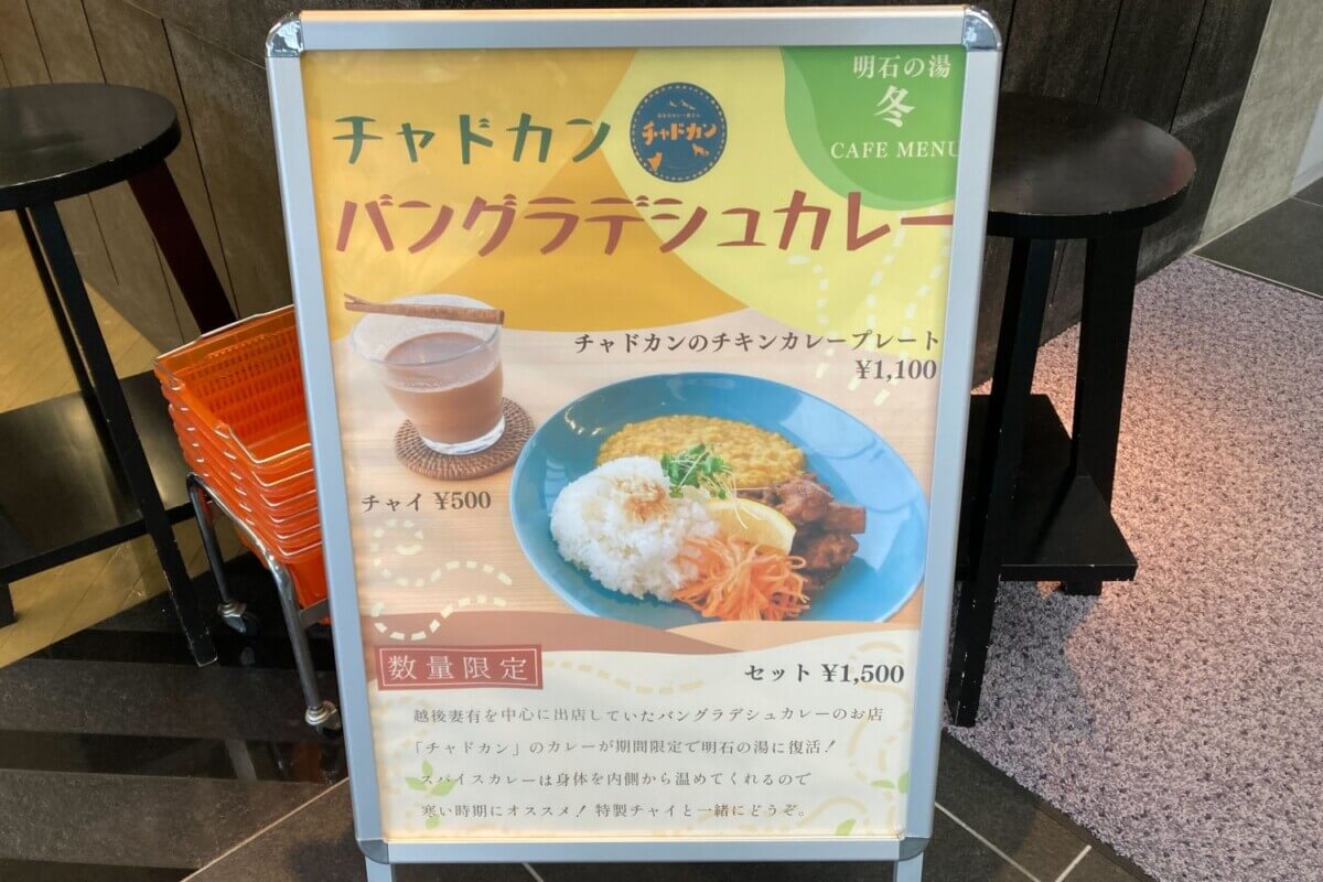1階にある明石の湯では、チャドカンのバングラデシュカレーが復活して登場! BSN新潟放送の人気番組「土曜ランチTV なじラテ」でも生中継で紹介されていたスパイスカレーです。身体を温めてくれるチャイとセットで。