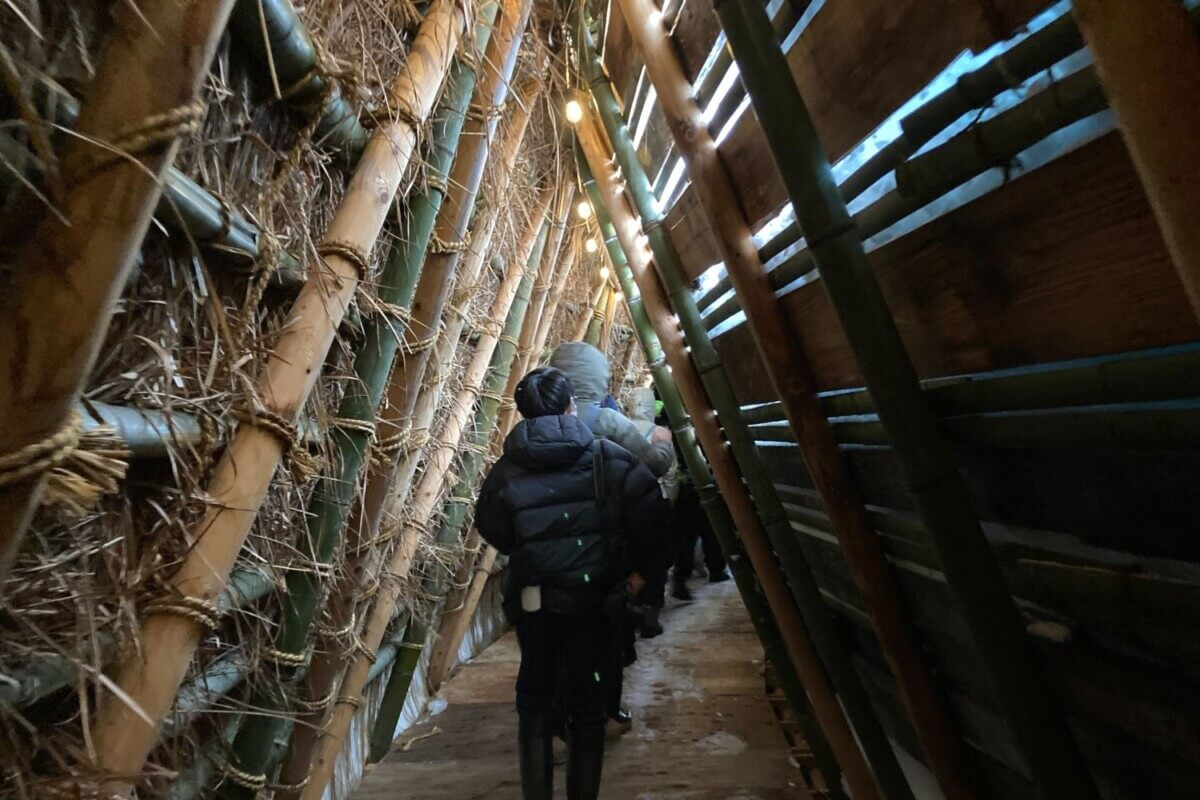 中は歩くのに十分な空間で、照明も灯っています。雪で外の音が遮断され、聞こえるのは来場者の足音と話し声。