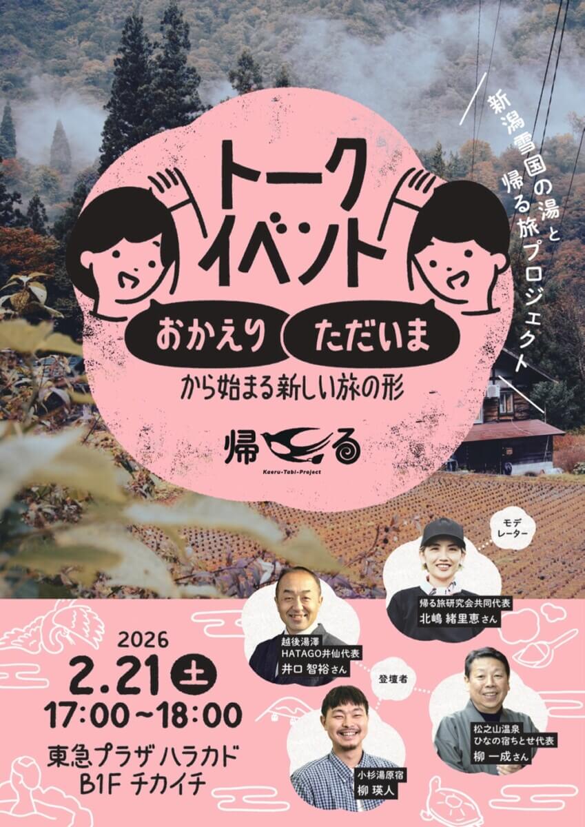 2月21日(土)には、小杉湯原宿内「チカイチ」エリアでトークイベント「『おかえり・ただいま』から始まる旅とお湯の話」 も開催。