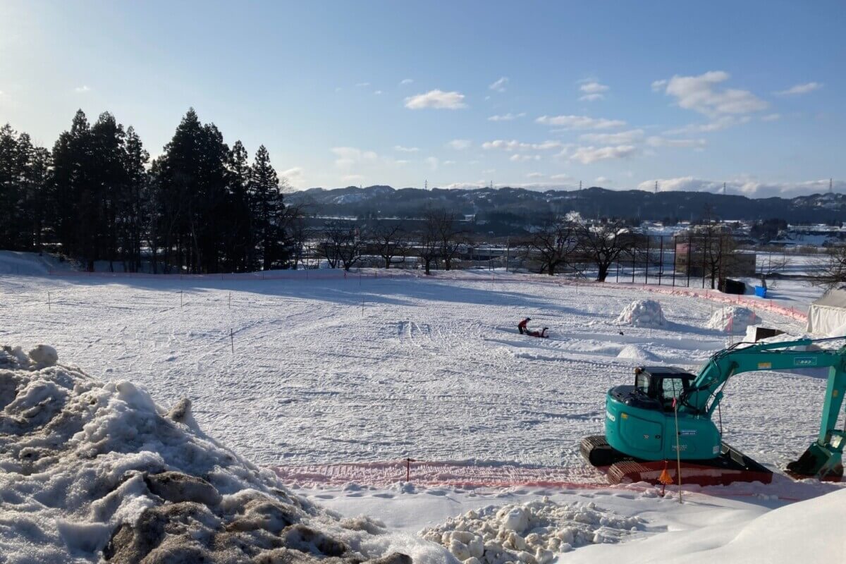 メインエリア「スノウリッチひろば」では、雪原がすっかり整地されていました。これからステージやテントの設営が行われます。2月21日、2月22日の2日間、飲食店街やステージショー、雪上アクティビティなどでお楽しみください。「虹雪花火」の観覧場所もこちらです。※2月20日は雪像3作品の展示のみで飲食店等の出店はありません。