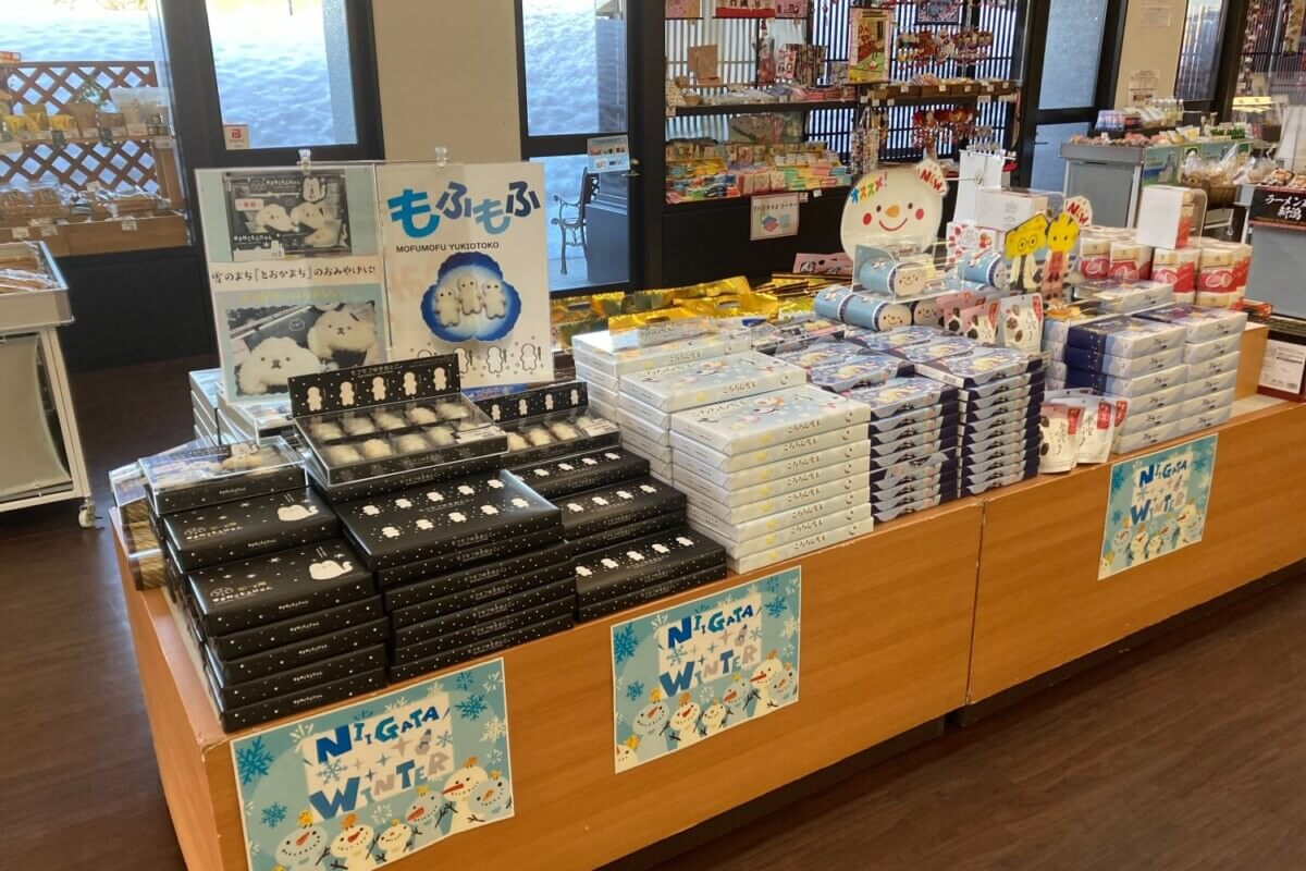 道の駅クロステンでは、冬らしいおみやげコーナーが設けられていました。新潟にちなんだものや雪だるまデザインのかわいいものなど種類豊富に取り揃えられています。2階では懐かしの「雪上カーニバルパネル展」も行われているので、立ち寄ってみてはいかがでしょう。