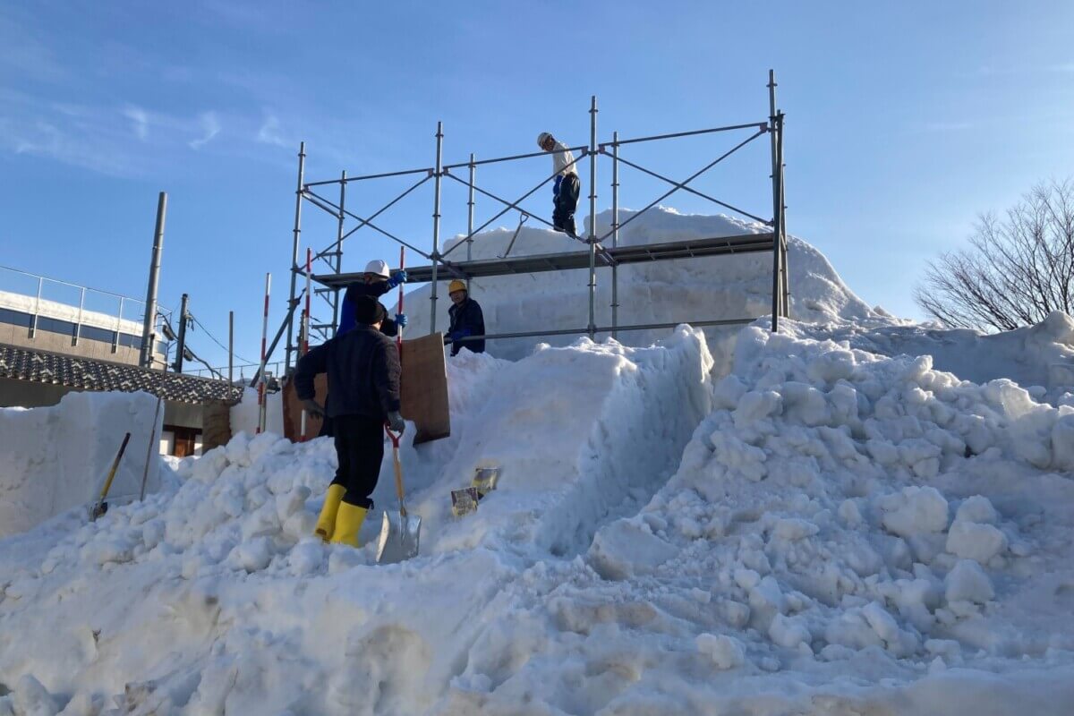 十日町駅から徒歩約10分の「お・も・て・な・し広場」に制作される雪像も少しずつ形が見えてきました。
