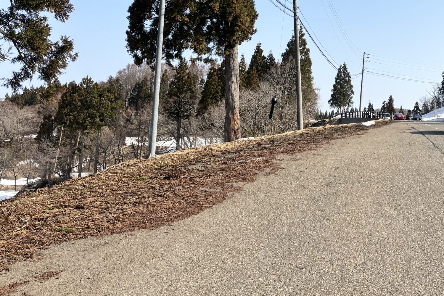 棚田が見下ろせる路肩に雪は無く、車を置くことができました。雪が消えるとこの場所に駐車する車両が増え、また残念なことに置いて行かれるゴミも増えます。撮影に行った時間には、地元と思われる方がゴミ拾いをされていました。