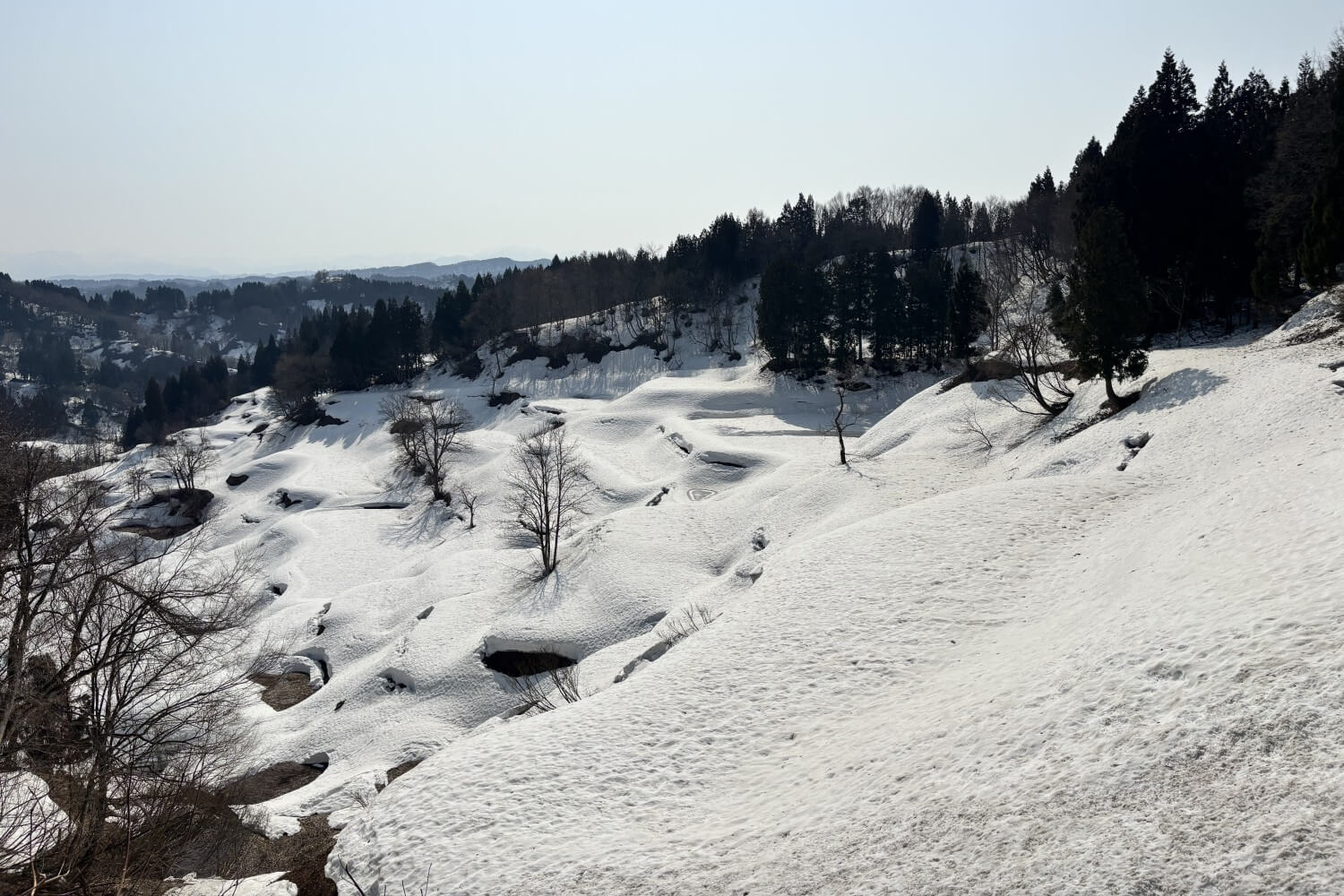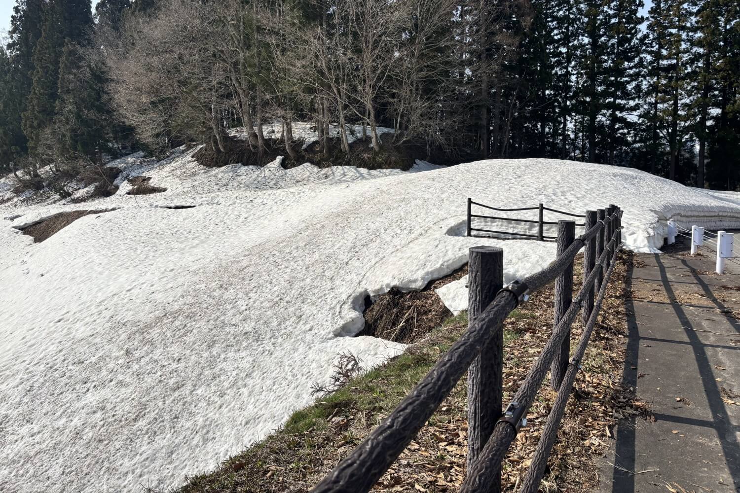 集落同士をつなぐ道沿いにある棚田なので、道路にも駐車場にも雪は無く、道路路肩から棚田を見下ろすことができます。雪どけが進み、棚田の段々が見えるようになってきました。展望台にはまだ、たっぷり雪が残っています。