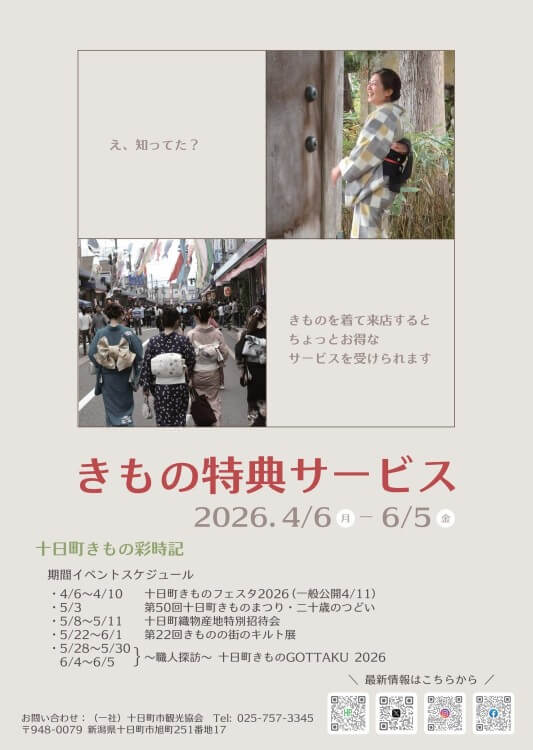 きものを『見て、着て、感じて』いただけるイベントが数多く開催される「十日町きもの彩時記」。2026年4月6日(月)~6月5日(金)の期間中、きものを着て来店頂くと市内の参加店舗でお得な特典を受けられる「きもの特典サービス」を実施中です。