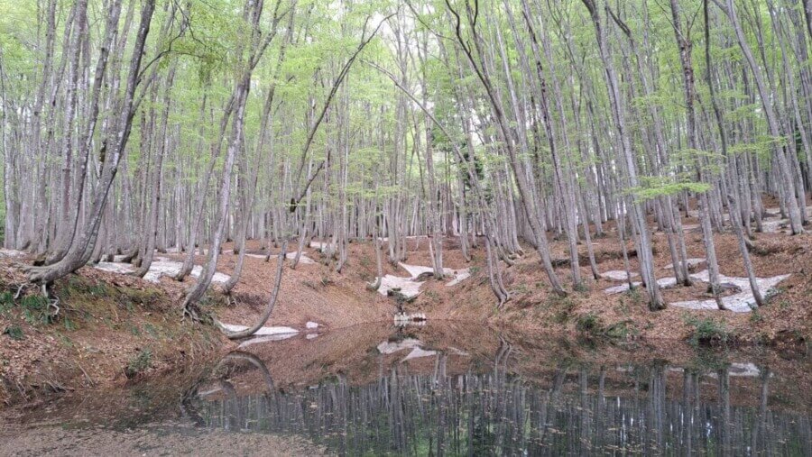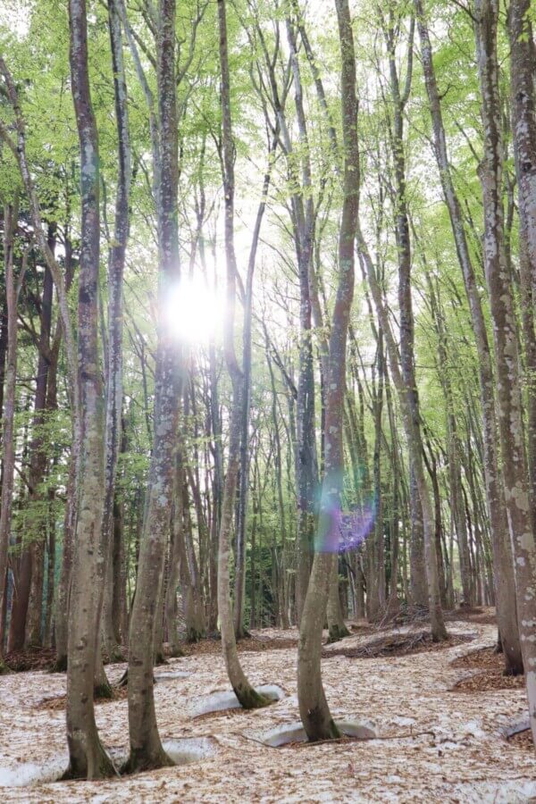 新潟県十日町市の松之山エリアにある人気スポット「美人林」は、春になると根開けや芽吹きが進み、雪国ならではの幻想的な景色が広がります。