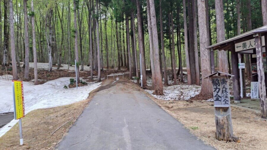 駐車場から美人林へ入る歩道には、一部雪が残っていました。