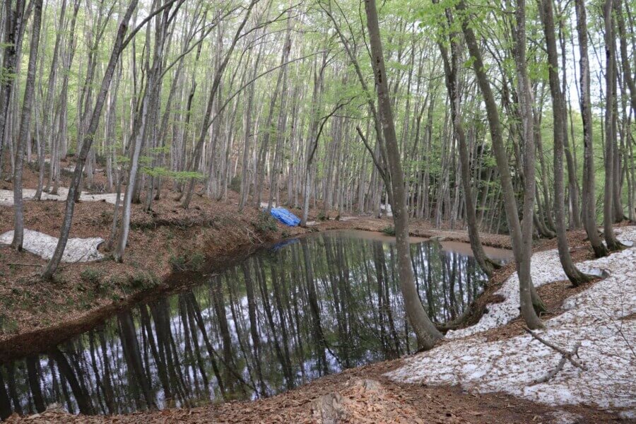 残雪と新緑が混ざり合う春の美人林は、ほんの短い期間だけ見られる特別な風景です。