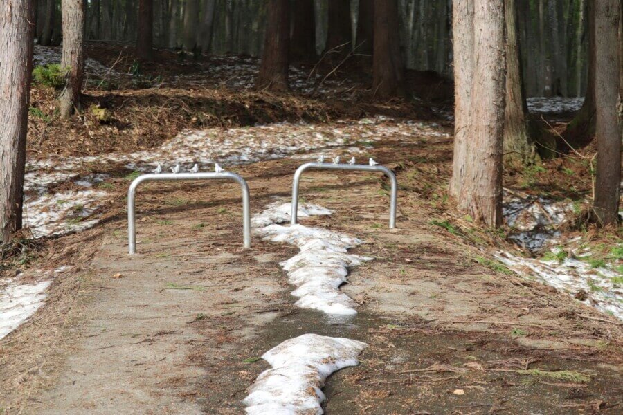 美人林内、車いす用の歩道にもまだ雪が残っています。
