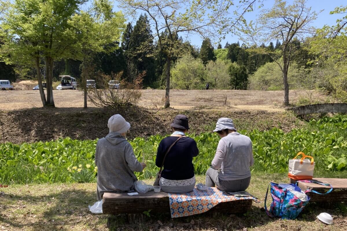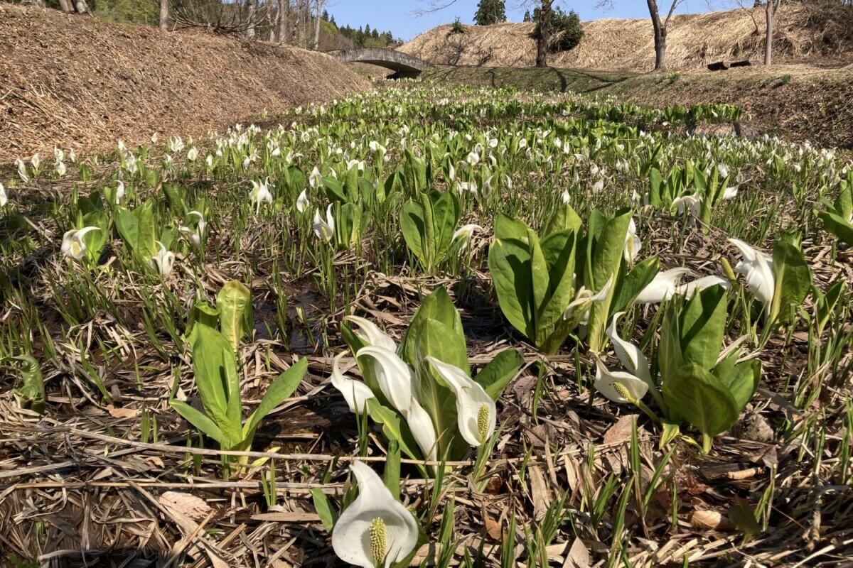 こちらの画像は4月14日に撮影した水ばしょうの様子です。満開に近くとてもきれいでした。タイミングが合えば周辺の桜も開花し、さらに春の絶景をお楽しみいただけます。ベンチでのんびりするのもおすすめですよ。