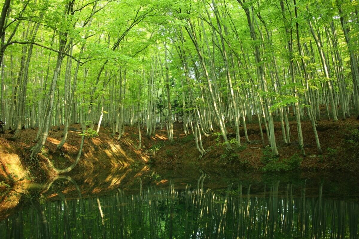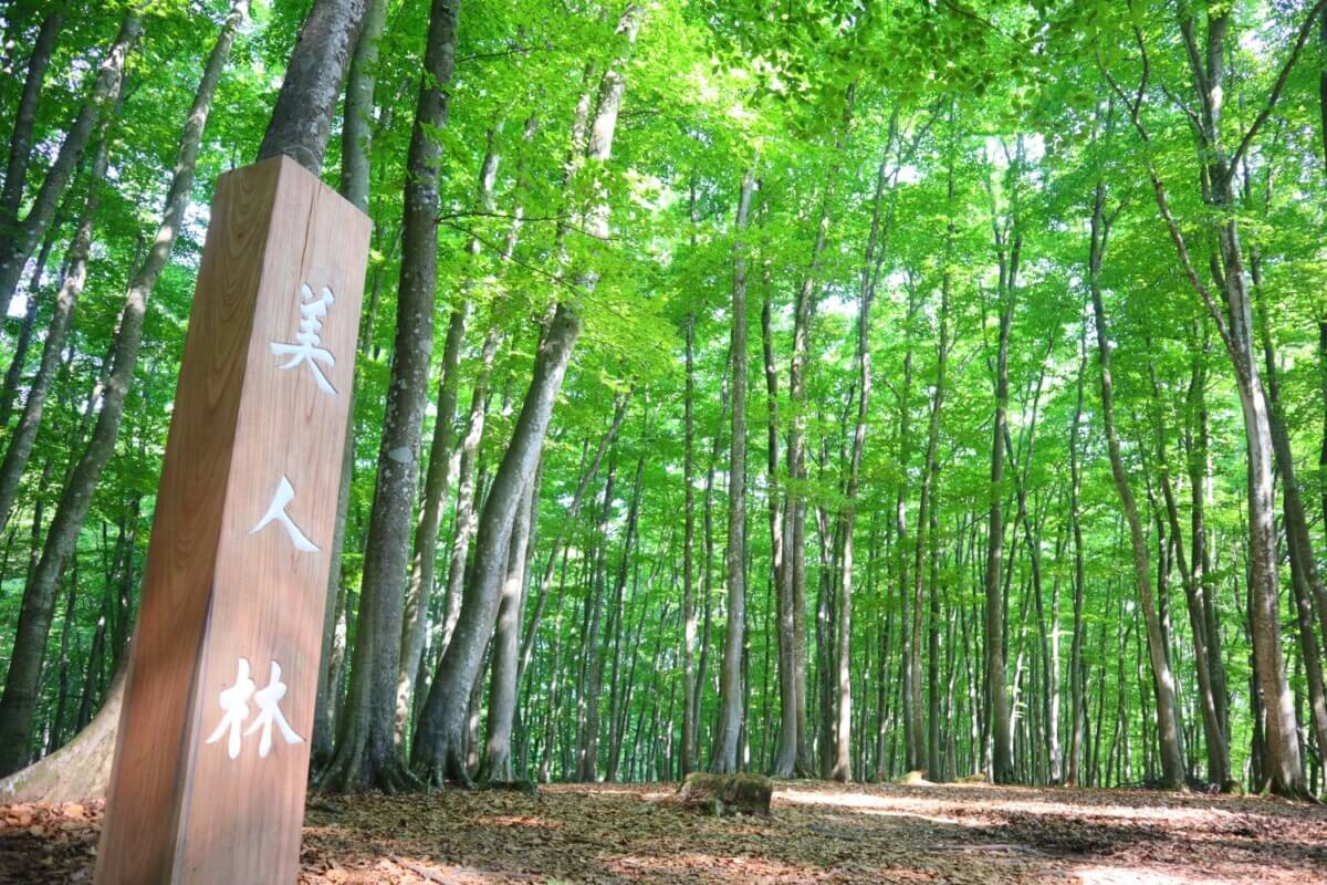 樹齢約100年のブナの木が丘に広がります。ブナの立ち姿の美しさから「美人林」と呼ばれるようになりました。また、多くの野鳥が生息していることでも知られています。