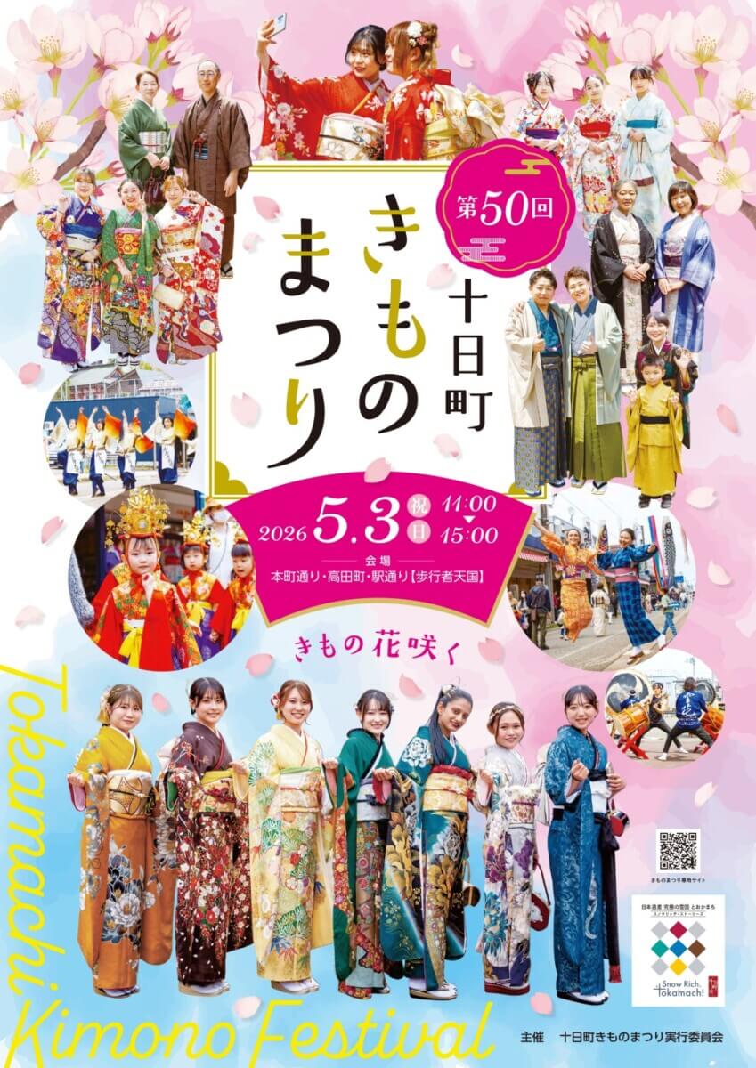 きものの街を彩る春の一大イベント「十日町きものまつり」。歩行者天国を会場に、飲食店が多数出店するマルシェやファッションショー、十三詣りに子ども花まつり稚児行列など様々な企画が催されます。「二十歳のつどい」が同時開催されます。
