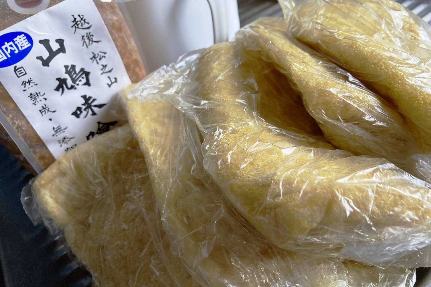 松之山温泉街のお豆腐屋さんで作られた美味しい油揚げやがんもどきが販売されていて、この日のお目当ては「油揚げ」。優しい甘み、生地の厚さは薄めな油揚げです。焼いて辛子醤油をつけて食べても美味しいのですが、今回はお稲荷さんにします。