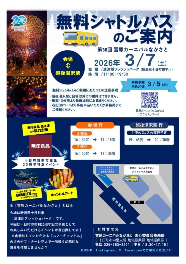 | 駐車場 | 会場には駐車場がありませんので、自動車送迎または十日町市役所 中里支所周辺の臨時特設駐車場をご利用いただき、会場まではシャトルバスをご利用ください。 |