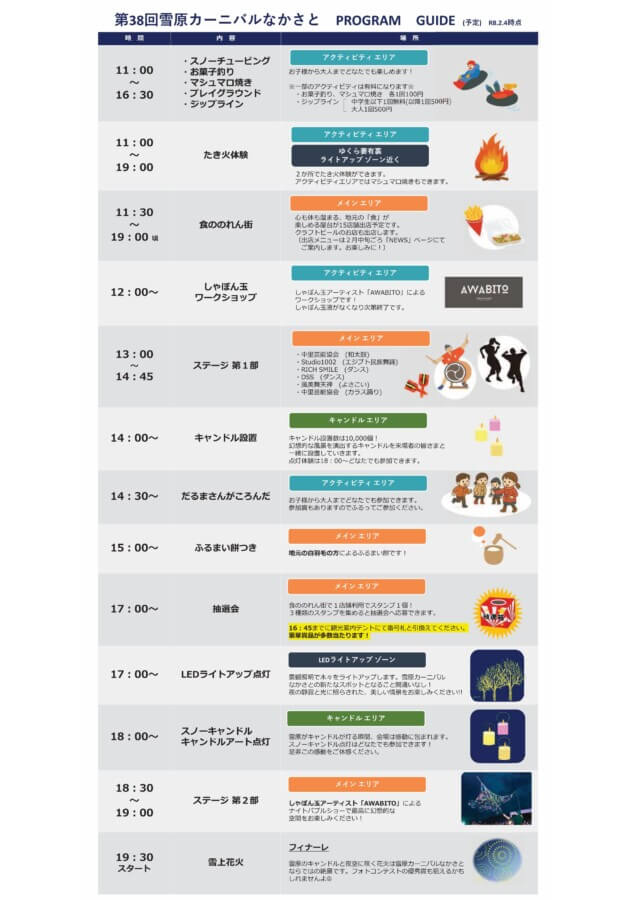 スノーキャンドル、打ち上げ花火、食ののれん街、ステージパフォーマンス、スノーチュービング、お菓子釣り、焚火マシュマロ焼き、プレイグラウンド、しゃぼん玉ワークショップ、ナイトバブル、抽選会 ほか
