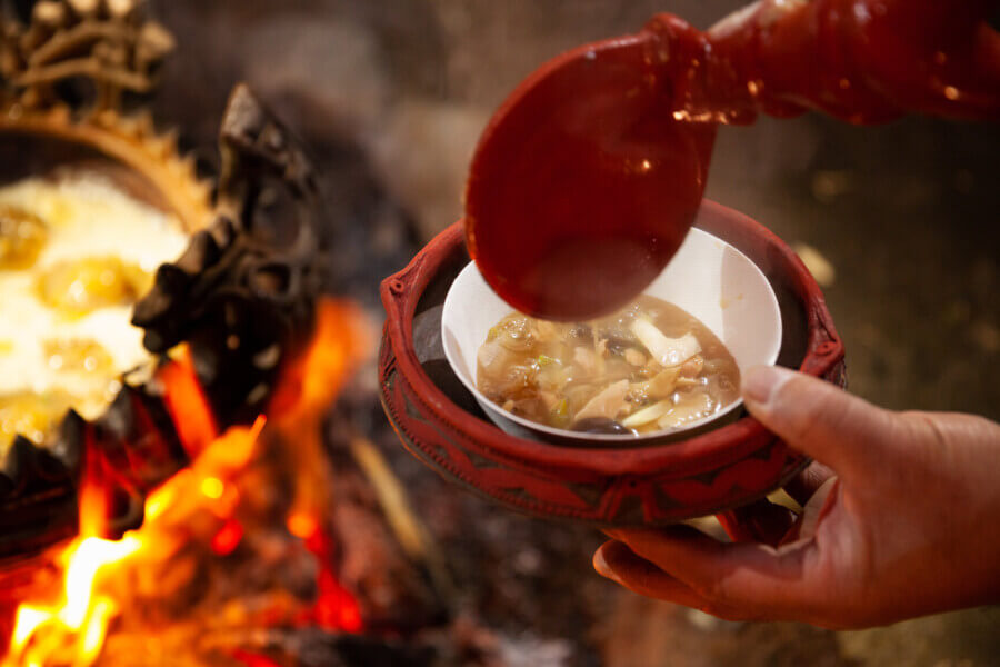 炭火で燻された香りが立ち込める竪穴住居の中で、火焔型土器レプリカを使用した土器鍋を召し上がれ。きのこや芋、鮭など縄文時代にも食していたとされる食材を用いて地元料理人が創作した自信作。