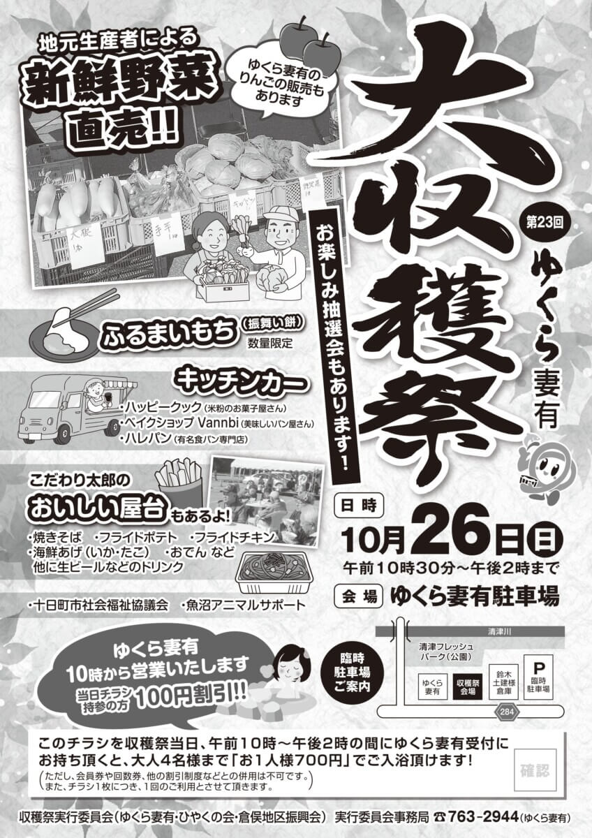 イベント 10/26 ゆくら妻有大収穫祭 2025.10.17 Facebook Twitter Line Link 地元生産者による新鮮野菜の直売や、キッチンカー、ふるまい餅(数量限定)などが開催されます。 今年はお楽しみ抽選会も開催!ぜひご家族そろってお出かけください。 開催日時 2025年10月26日(日曜日)午前10時30分~午後2時まで 場所 ゆくら妻有駐車場 関連リンク 原町温泉 ゆくら妻有